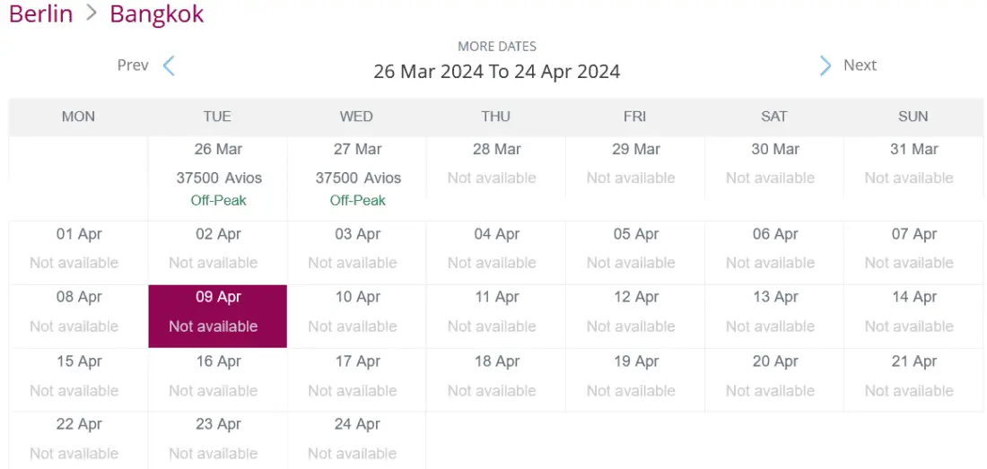 It is not directly apparent on the website which dates fall into the peak and which into the off-peak season. Sometimes it is displayed in the 30-day calendar, but this does not work very well anyway. In the following case, there are economy tickets almost every day, yet it says not available. At least until March 27, the off-peak prices apply:
