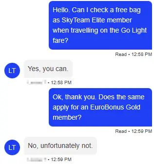 • New: As a SkyTeam Elite (Plus) frequent flyer, you get one piece of checked baggage (up to 23 kg) for free in the Go Light fare. However, this does not apply to EuroBonus members but only to frequent flyers of other programs like Flying Blue, Delta SkyMiles, etc.