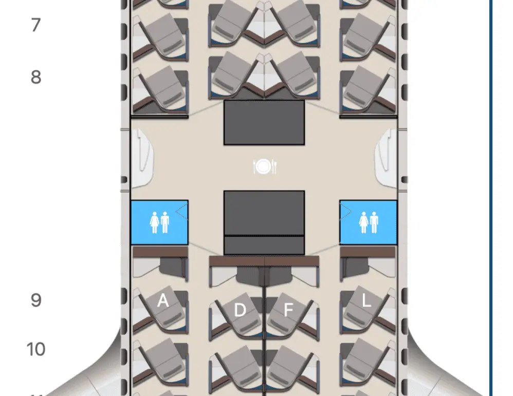 The newly delivered Boeing 787-9s will feature a total of 64 Business Class seats. The arrangement is particularly interesting. United is moving away from its previous staggered layout and opting for a (reverse) herringbone configuration. In the centre of the cabin, there will be a herringbone setup where passengers’ heads are positioned close together. In the forward Business Class cabin, a reverse herringbone layout will be used, meaning passengers’ heads face away from each other, offering more privacy. This is designed to appeal to both solo travellers and couples. This layout can be clearly seen in Aerolopa’s seat map: